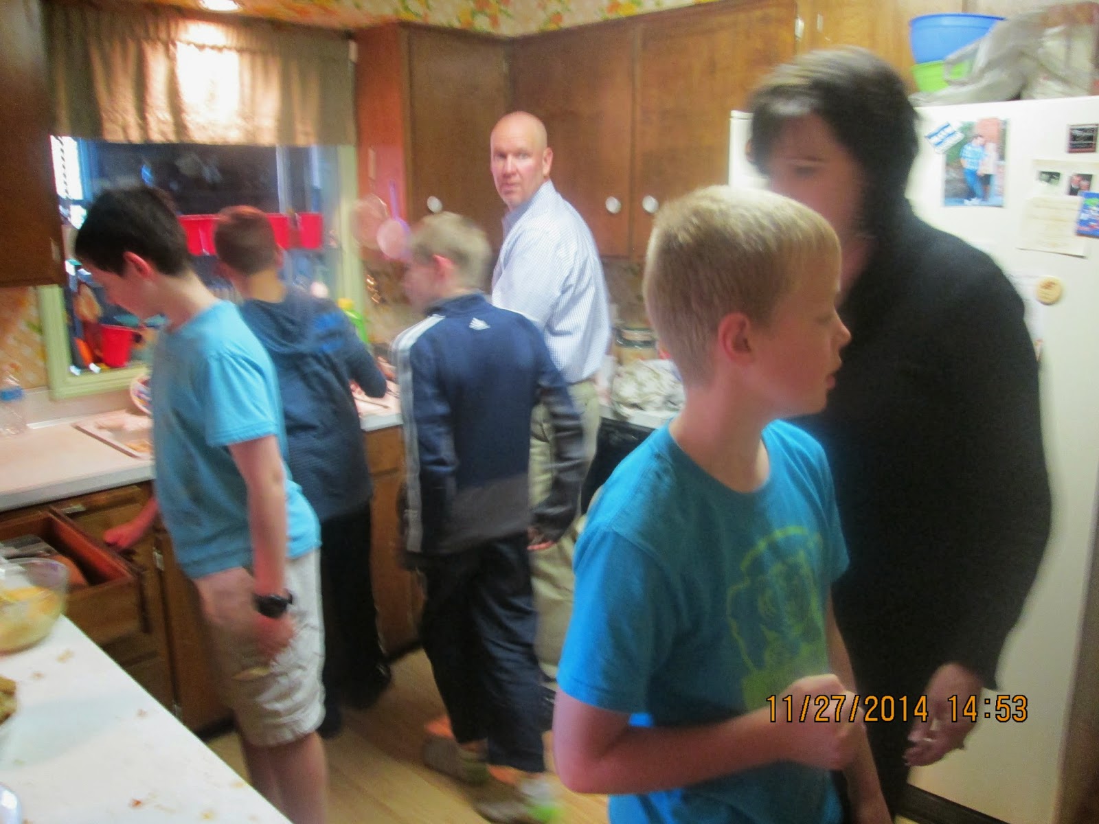 Then it was time for Thanksgiving Dinner. John and Jerry were in charge of cooking the four turkeys. They were way more adventuresome than how my Grama Huffaker, my Mom "Grama A", and I roasted just a plain ol' turkey in the oven. Well, they did do one traditional one in a roaster so as not to panic this Grama too much.